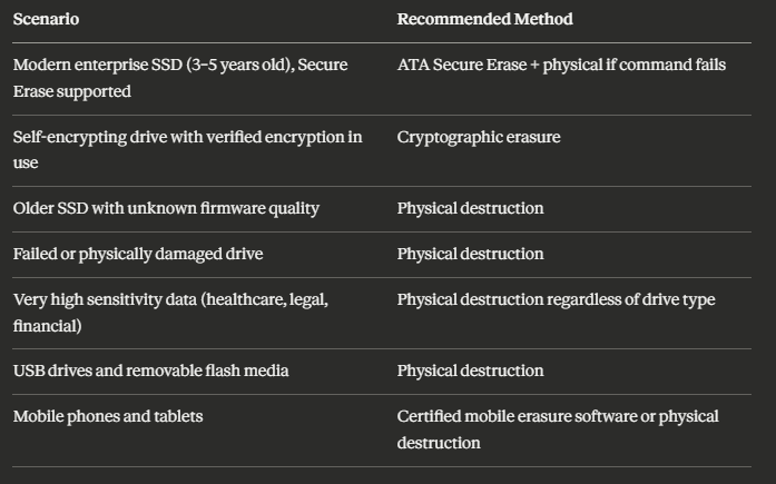 It is a defensible position — particularly for organisations handling sensitive data at scale — but it is not the only valid approach. Physical destruction is more expensive than software-based erasure, and for high volumes of relatively modern SSDs where ATA Secure Erase can be reliably executed and verified, software-based methods with robust documentation are appropriate.