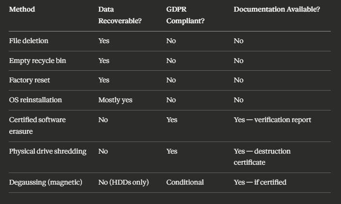 The only GDPR-compliant methods are certified software erasure (with verification report) and physical destruction (with destruction certificate)