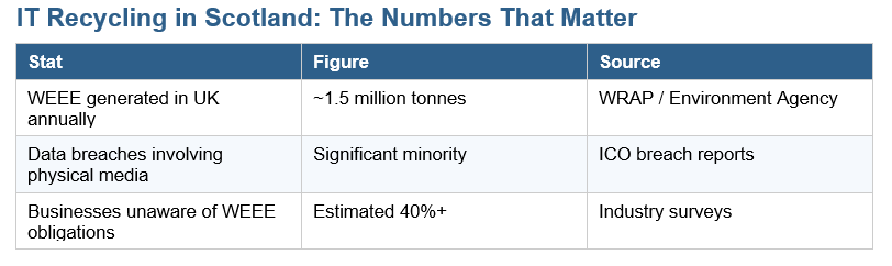 I have spent time reviewing how Glasgow businesses handle end-of-life IT, and the pattern I see repeatedly is the same: organisations are not struggling with willingness to recycle. They are struggling with knowing how to do it correctly. This guide walks through exactly that. If you want to understand the full legal landscape across Scotland first, my guide on IT recycling for Scotland businesses covers the regulatory picture in detail.