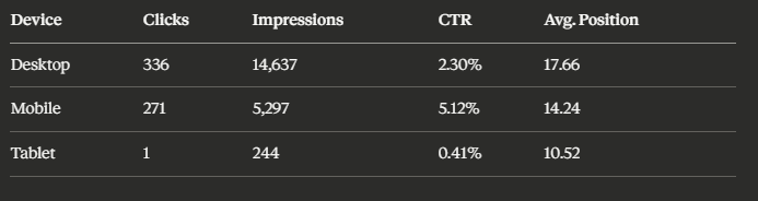 Mobile CTR (5.12%) outperforming desktop (2.30%) suggests mobile users have higher intent — content needs to be optimised for mobile reading and mobile search presentation