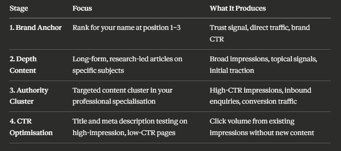 Most personal brand builders spend all their energy on stage 2 and skip stages 1, 3, and 4 entirely. The data shows that stage 1 (brand anchor) and stage 4 (CTR optimisation) are the two fastest levers for meaningful traffic improvement at any stage of the build.