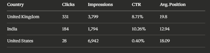 The UK at 8.71% CTR and India at 10.26% CTR are performing exceptionally — meaning the content is highly relevant to searchers in those markets and the titles are earning the click. The task is replicating that performance in the US.