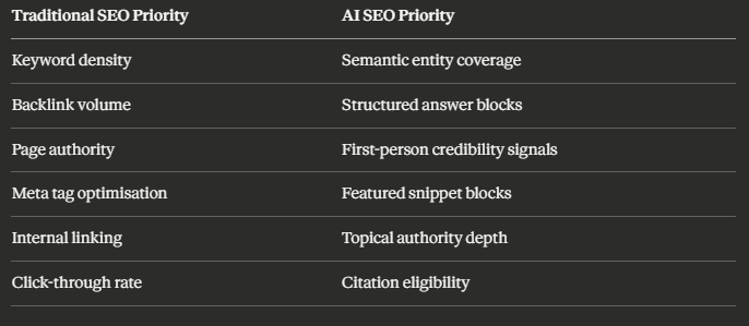 Traditional SEO focuses on ranking in blue-link search results through keyword optimisation, backlinks, and technical performance. AI SEO focuses on being the source AI engines cite when generating answers. The two overlap significantly, but AI SEO places greater weight on structural clarity, entity coverage, and extraction ease — not just ranking signals.